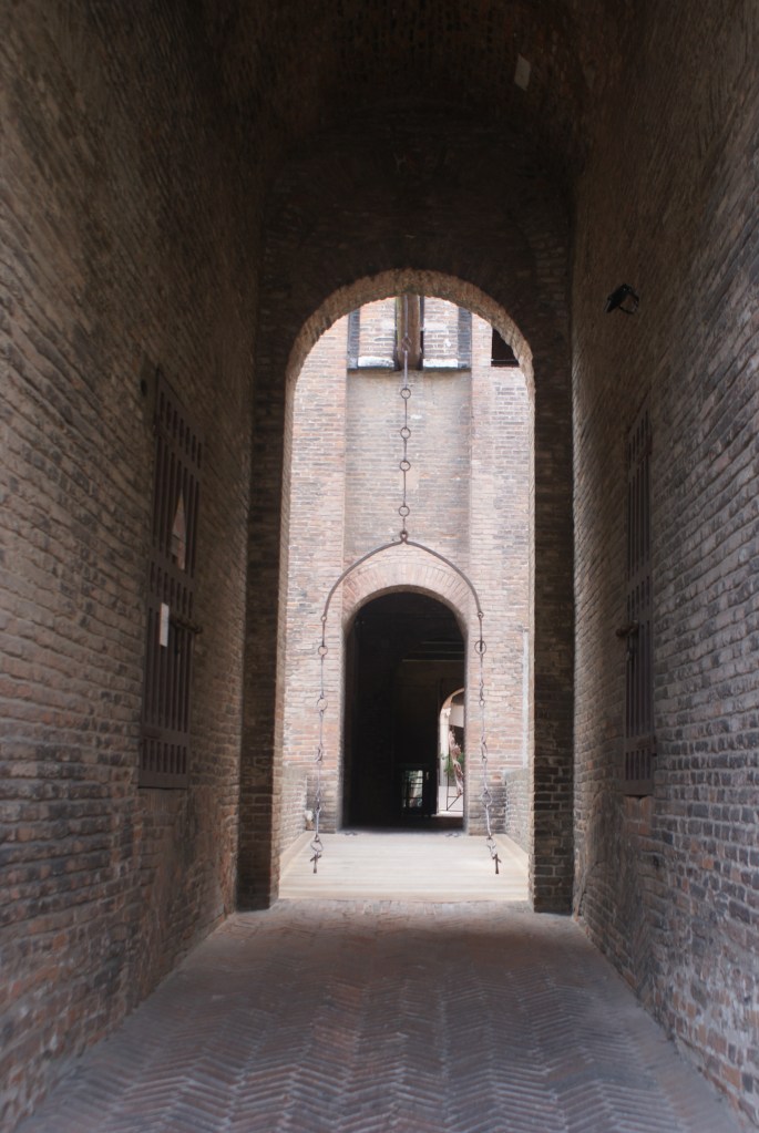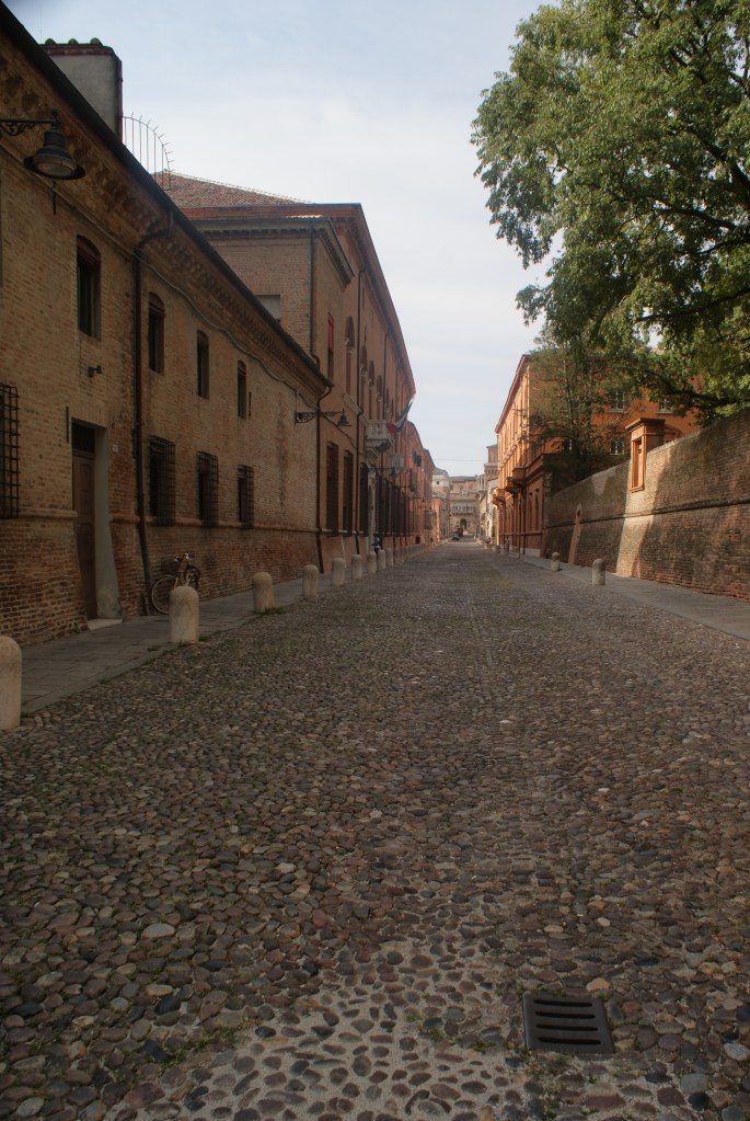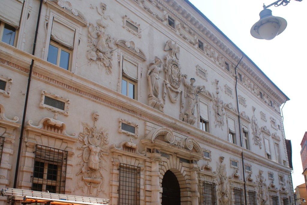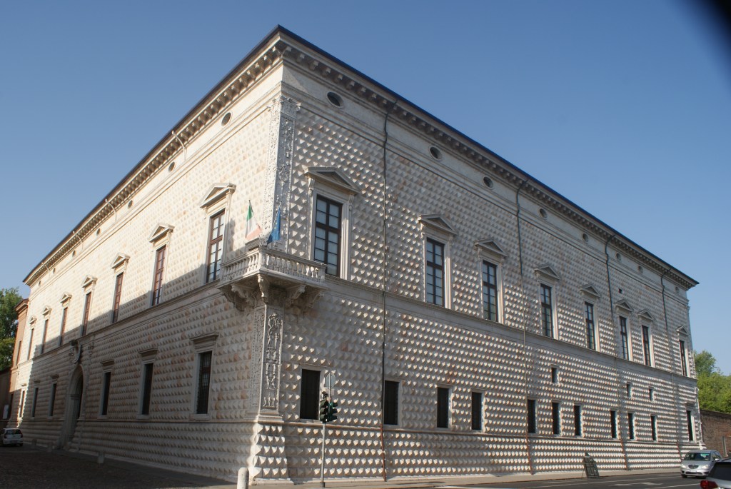 Wanneer ik op een zonnige zomerdag mijn hotel verlaat kom ik als eerste “Palazzo dei Diamanti” tegen. Het dankt zijn naam aan de roze en witte marmeren steentjes in de vorm van een piramide (diamant). Het museum herbergt een collectie van middeleeuwse schilderijen (tot de 18e eeuw) maar ook wisselende tentoonstellingen van hedendaagse kunst.